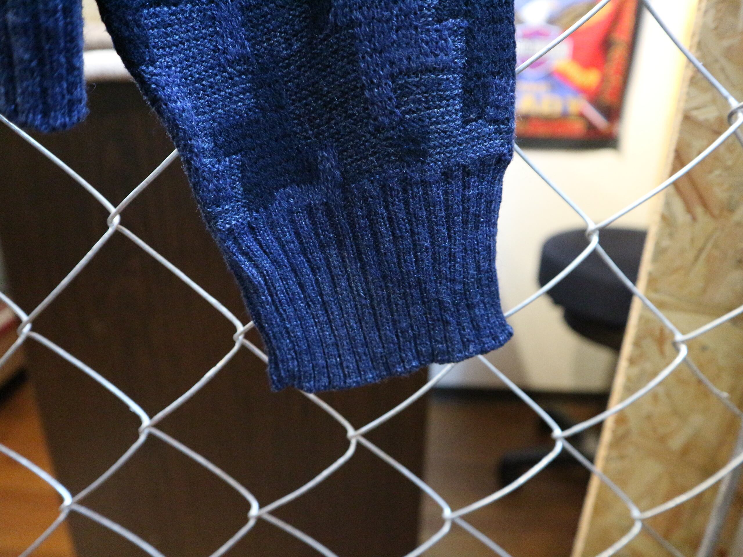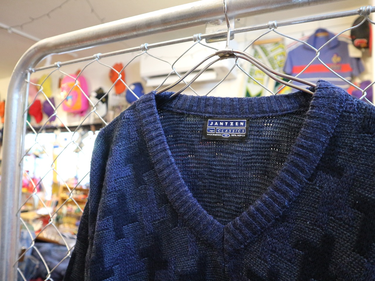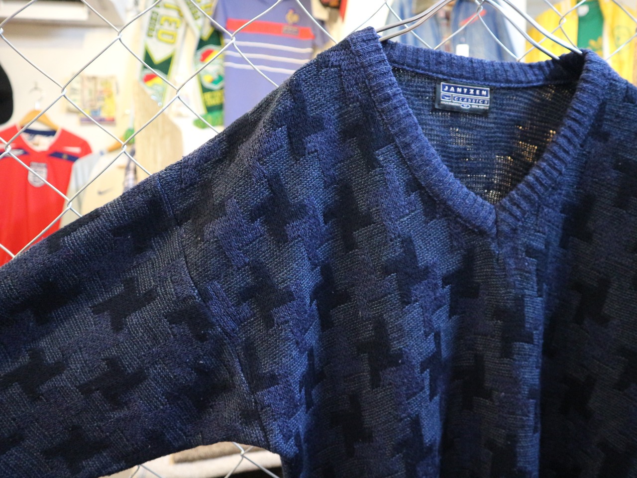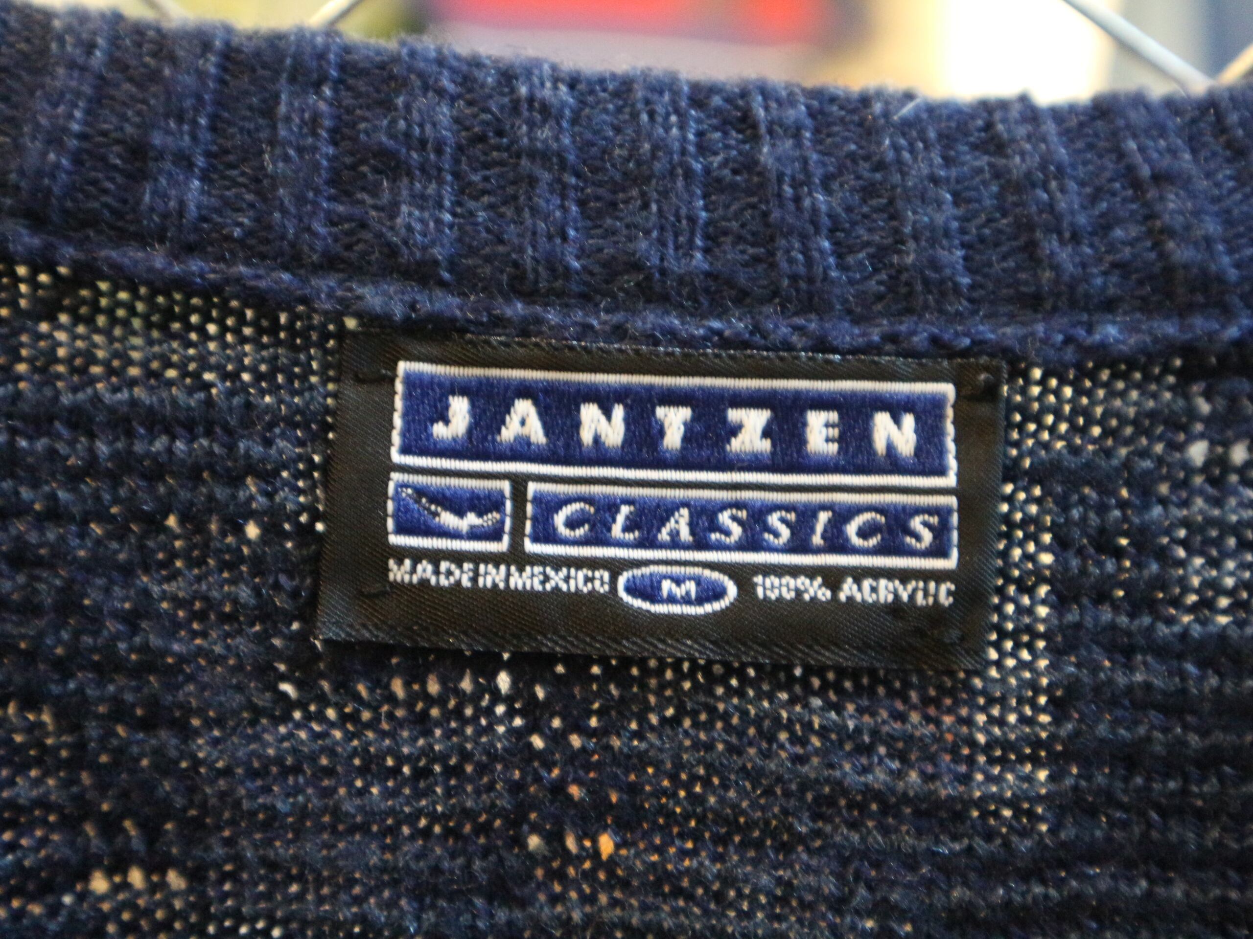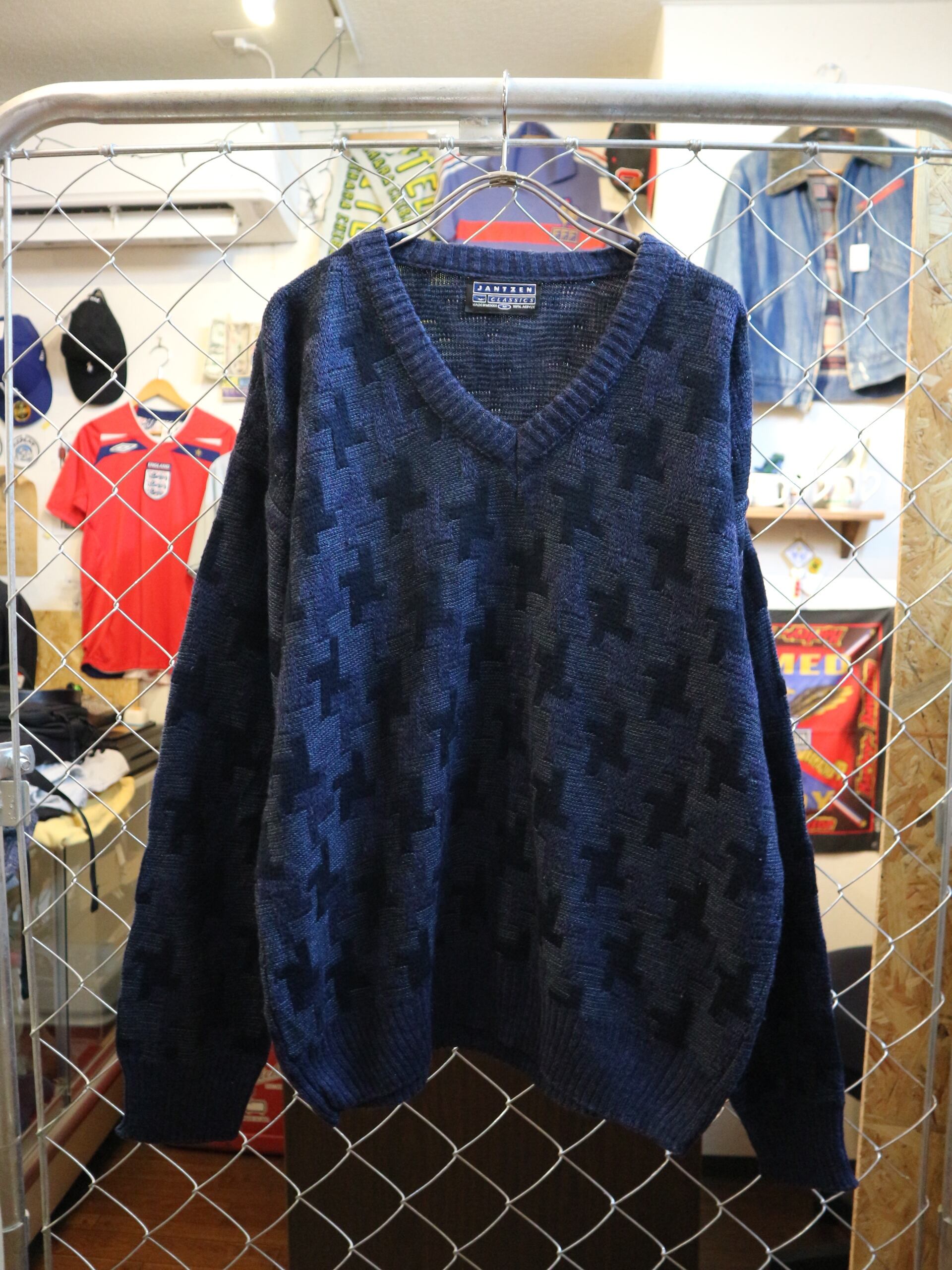 USA古着JANZENジャンセン★90年代メキシコ製長袖ニットセーター総柄★Ⅴネックアメカジアメトラア★サイズMアクリル100%紺系