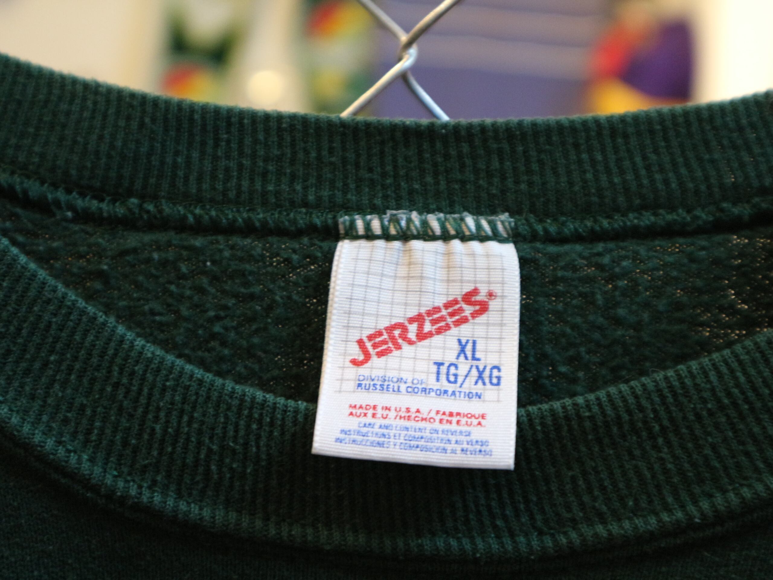 USA古着JERZEESジャージーズ★90年代USA製刺繍入りスウェット★アメカジワンポイント★ビッグサイズXL★ポリコットン深緑